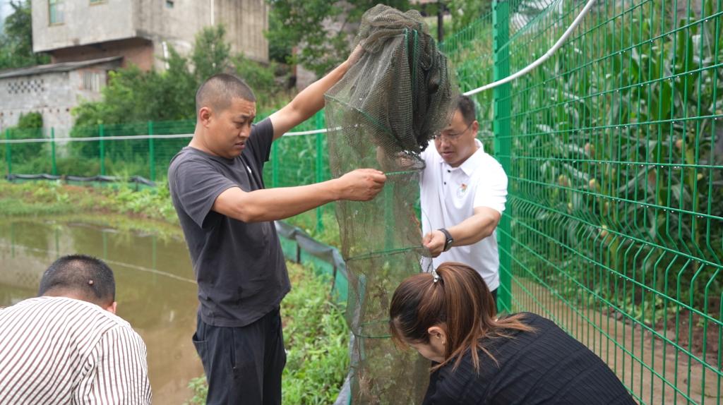 在永风村水产基地,文学钊向团队成员详细介绍了永风村在推动集体经济特色产业发展方面的做法。永风村始终遵循因地制宜的原则,着重发展水产养殖产业,主要涵盖大闸蟹、鱼类等品种,其水域养殖面积已接近1000平方米。该村还积极采用生态喂养模式,通过利用螃蟹的剩余饲料喂养小鱼、小虾、水草等,形成了良性的生态循环。在促进永风村水产养殖业可持续发展的同时,也为大力推进乡村振兴战略提供了坚实的产业支撑。